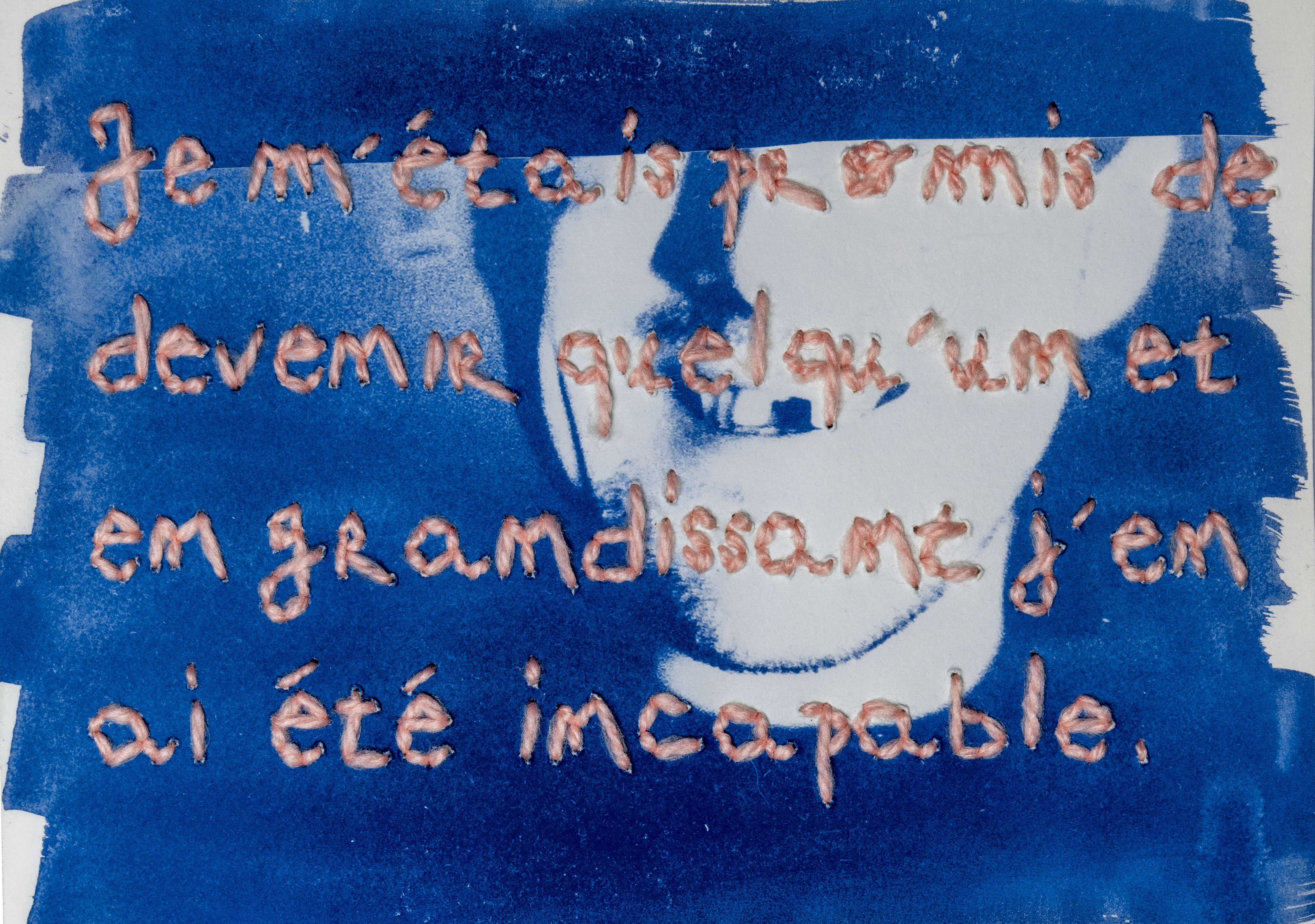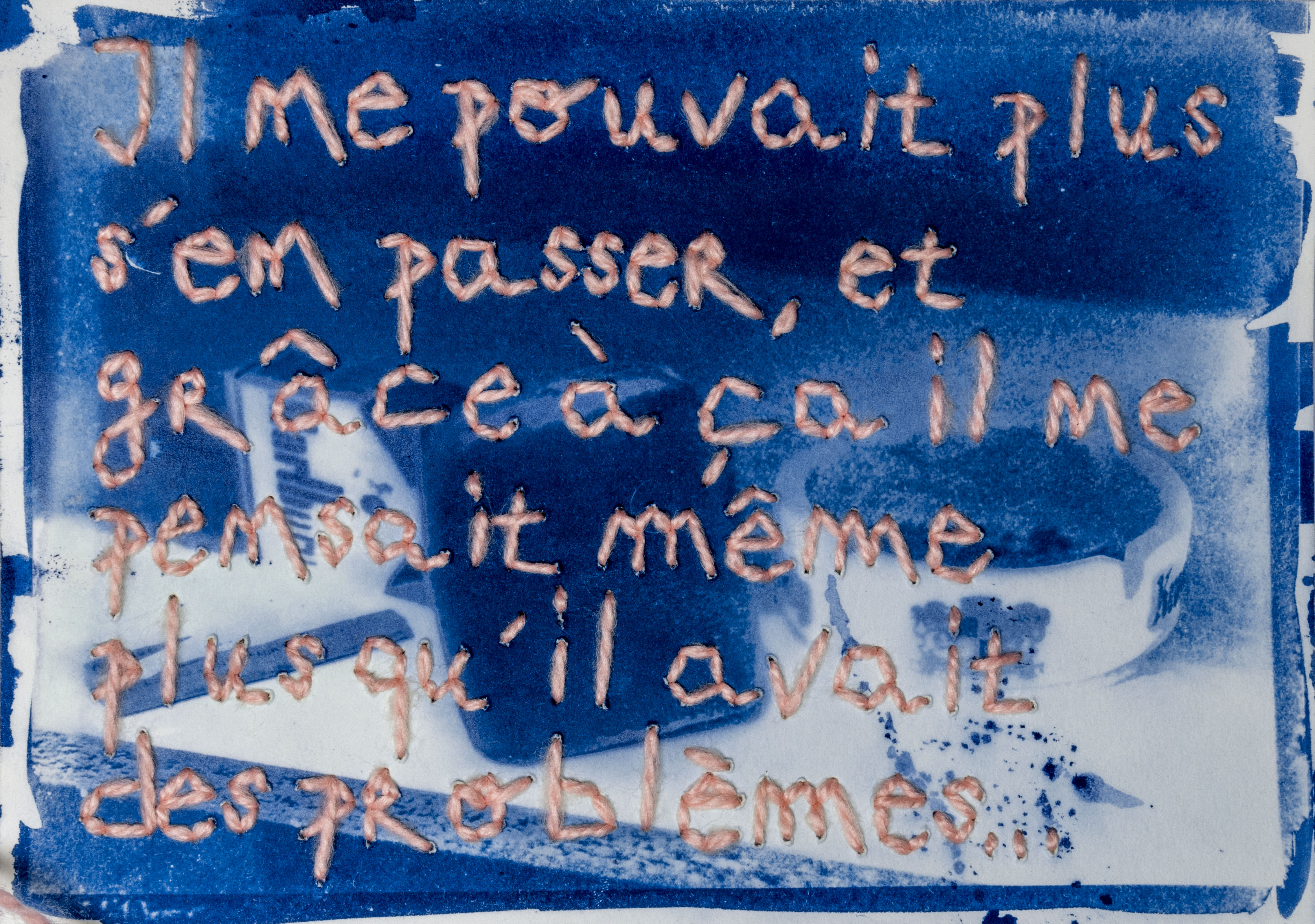 J’ai commencé à photographier Didier parce qu’il me fait beaucoup penser à mon père Olivier. Ils partagent un talent pour l’humour ainsi qu’un goût prononcé pour l’alcool en très grosse quantité. Olivier lui n’a pas trouvé la force de résister face au poids de ses problèmes et il a décidé de se suicider. J’ai gardé de lui des pellicules argentiques et une lettre d’adieux, que je choisi de lier ensemble en réalisant des cyanotypes sur lesquels je viens broder ses derniers mots. J’envisage la broderie comme un acte de soin pour transformer le trauma en objet de mémoire.