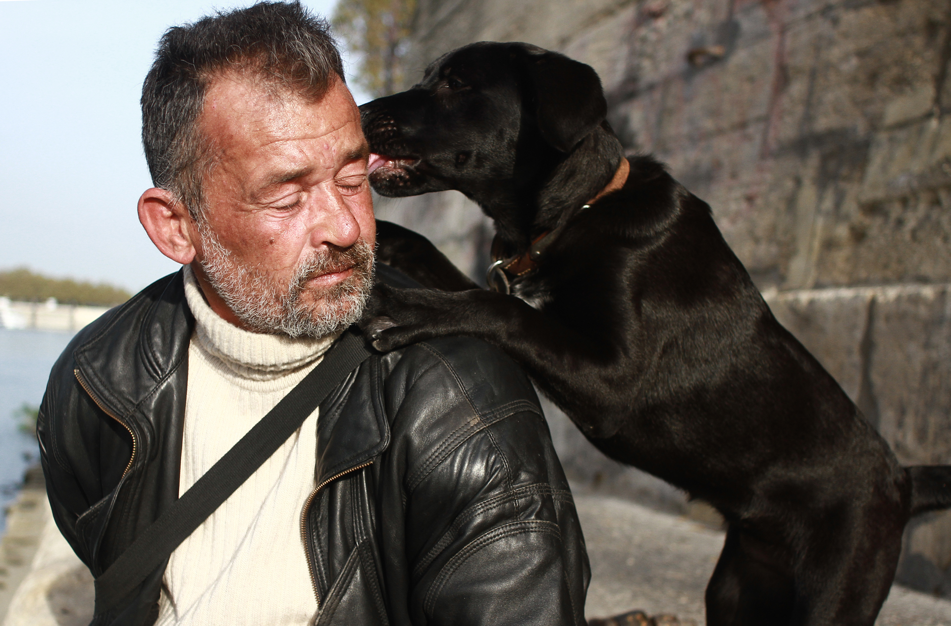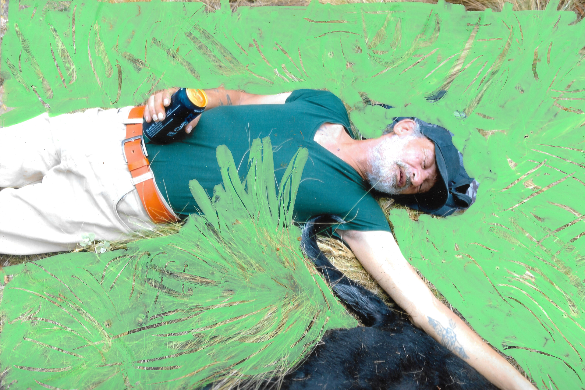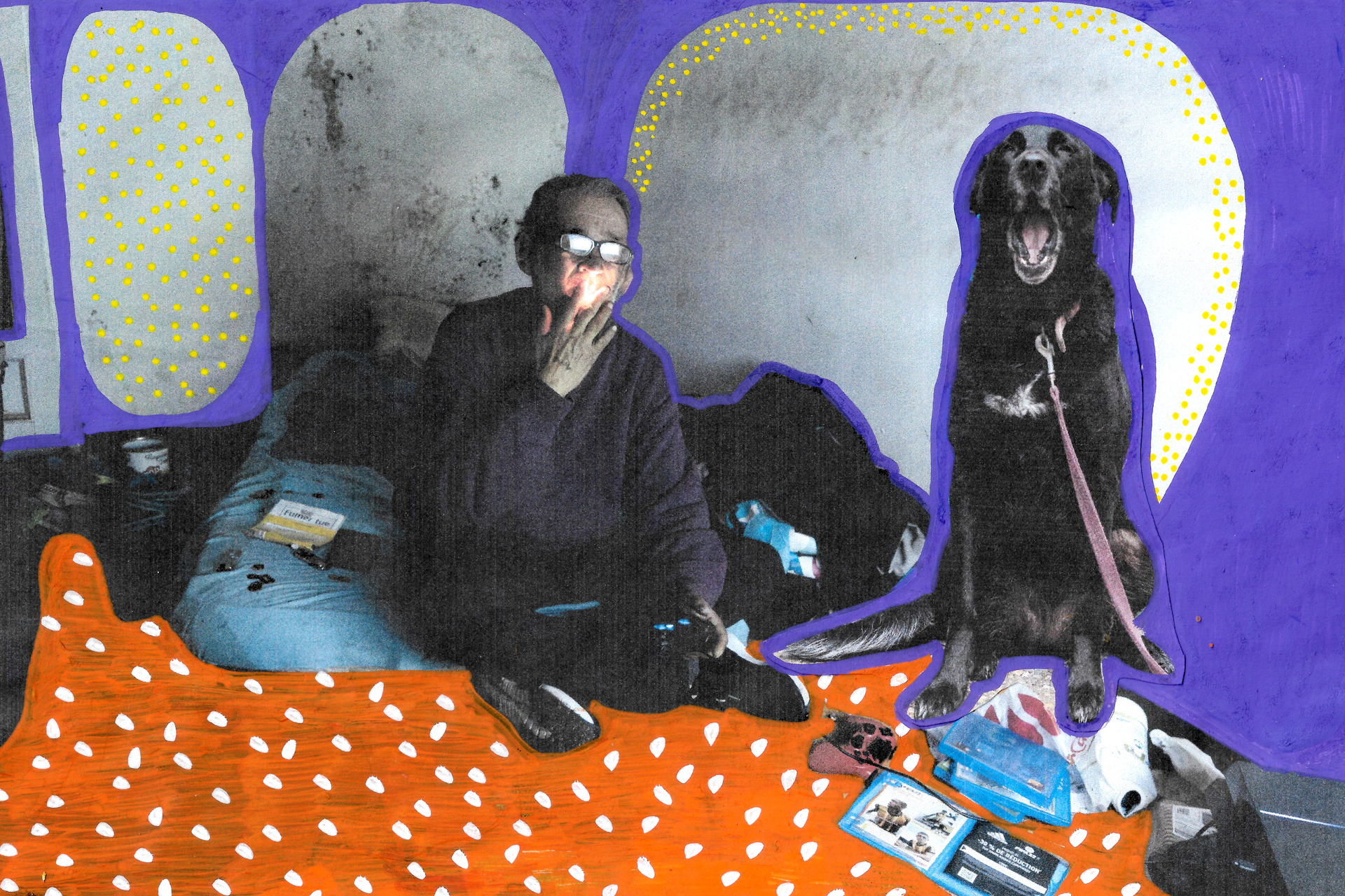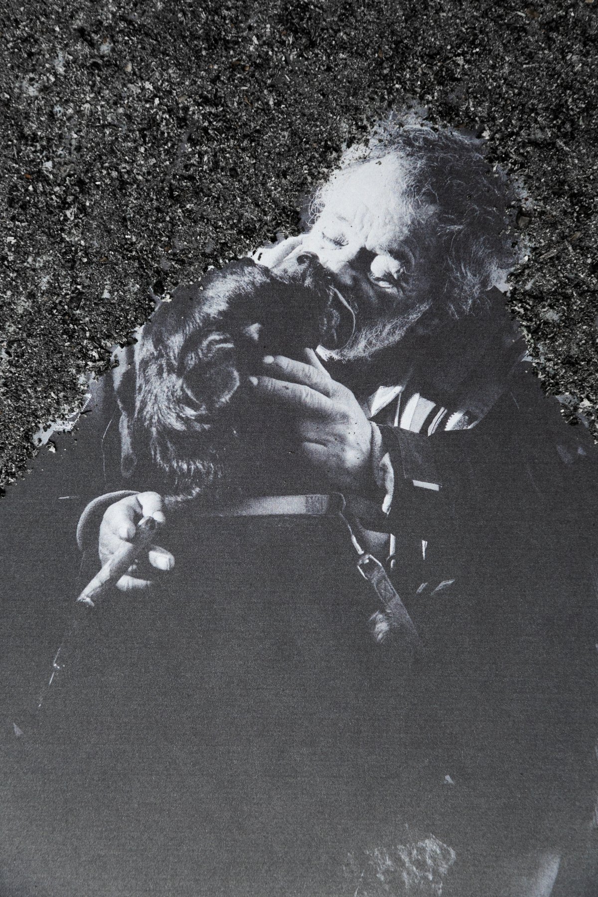 Ce projet est né d’un dialogue entre l’intime et le social. Il met en résonance les sensibilités de deux personnages partageant la même vulnérabilité. Deux hommes liés par l’isolement et l’alcool, stigmatisés par la précarité. Il y a d’un côté Didier, accompagné par sa chienne Daisy, habitués des trottoirs et des bancs publics. Il porte en lui les traces d’une existence marquée par le rejet, les excès et une forme de résistance joyeuse utilisée comme bouclier. Il prône un bonheur simple, des bières, une blague, du reggae. On se donne rendez-vous dans les rares lieux de la ville dans lesquels il ne se sent pas jugé : la cour arrière du cloître, les escaliers derrière l’église, la marche devant la boulangerie pour faire charger son téléphone. Didier met de la musique et la session photo commence. On discute beaucoup puis je lui apporte les images imprimées, parce qu’il m’a avoué qu’avant de démarrer ce projet il avait oublié à quoi il ressemblait. J’interviens ensuite sur les tirages en ajoutant ou grattant de la matière pour retranscrire mon ressenti sur ces instants partagés. C’est une manière de redonner de l’épaisseur à un homme que la société a aplati par le stigmate.