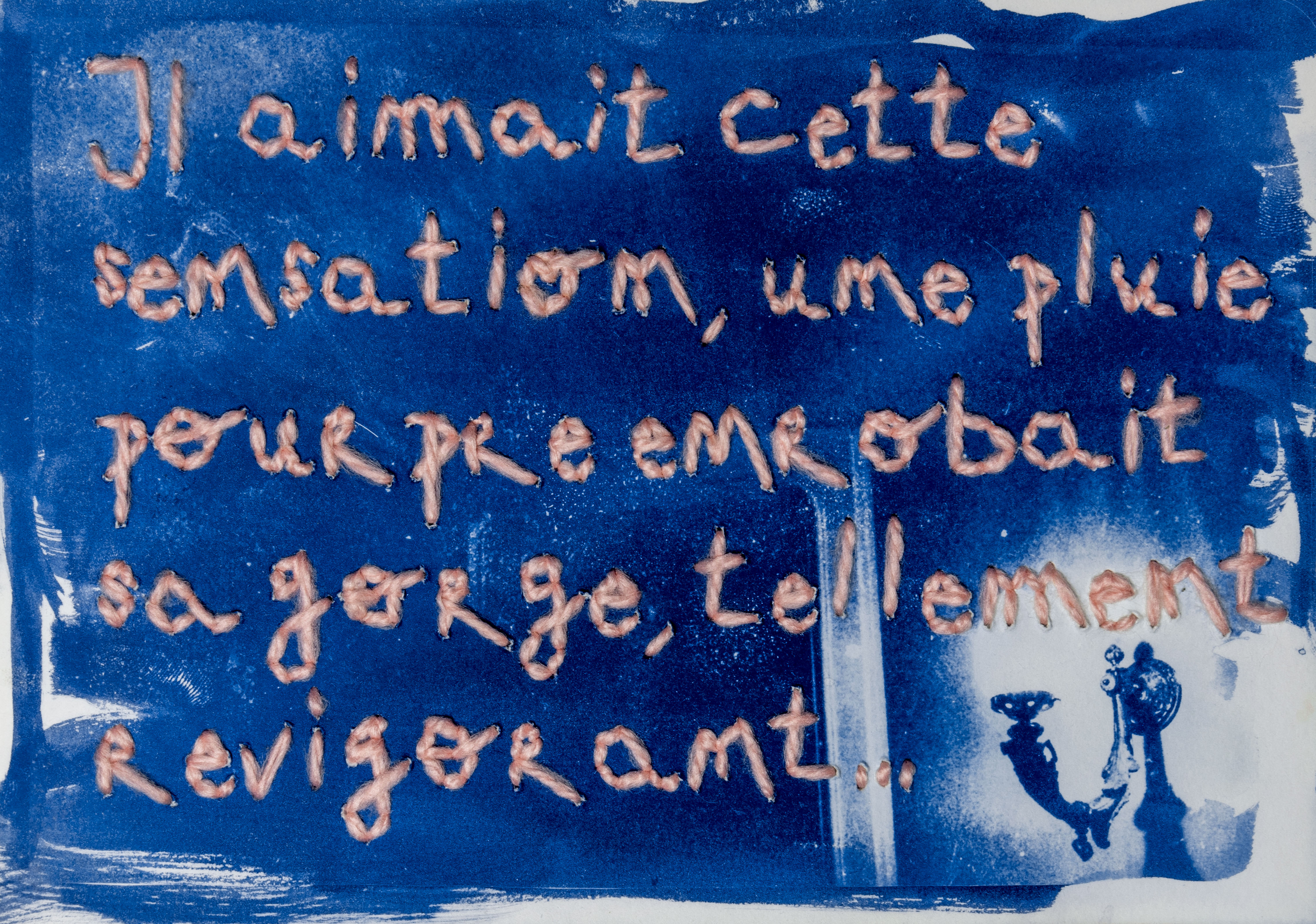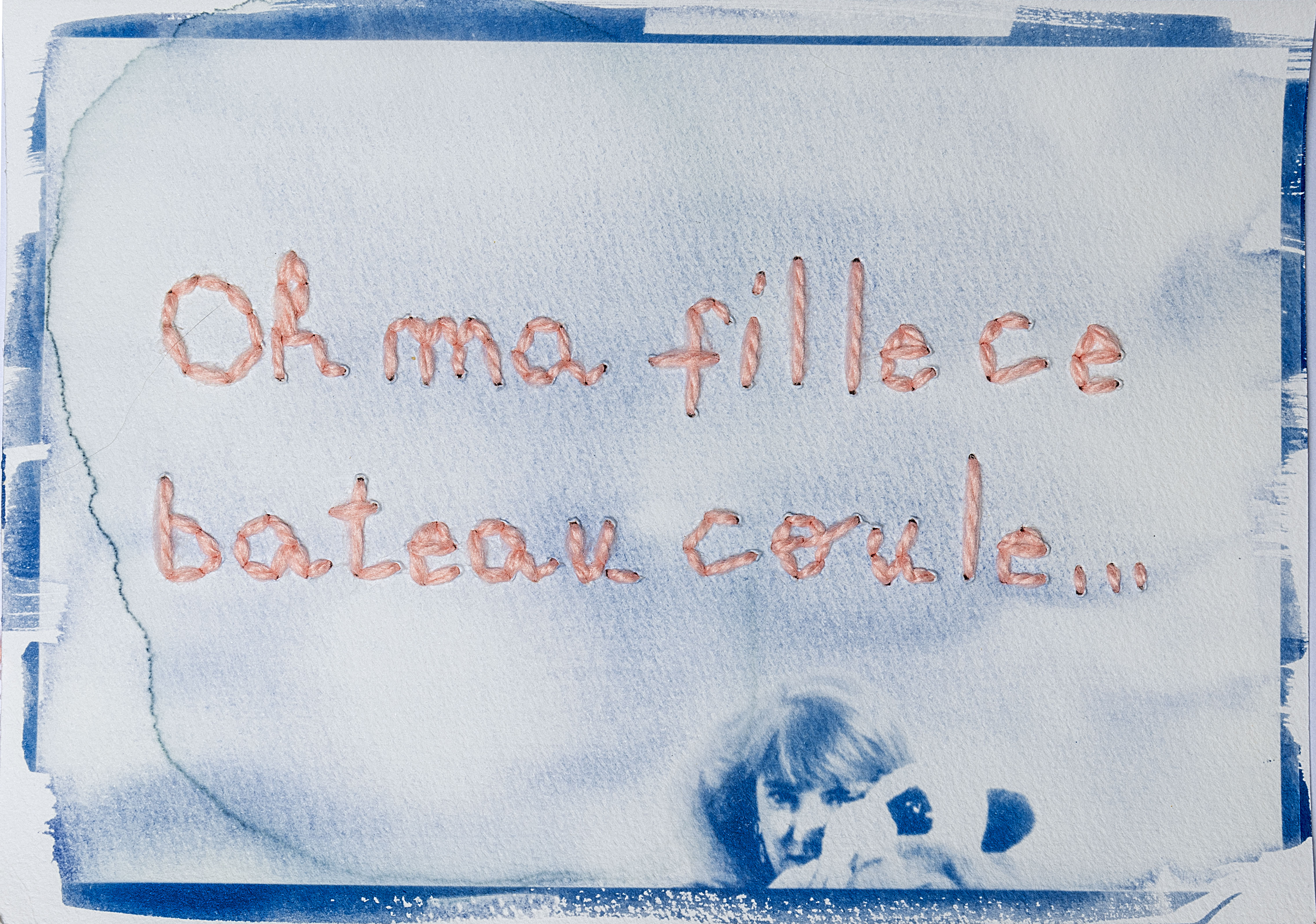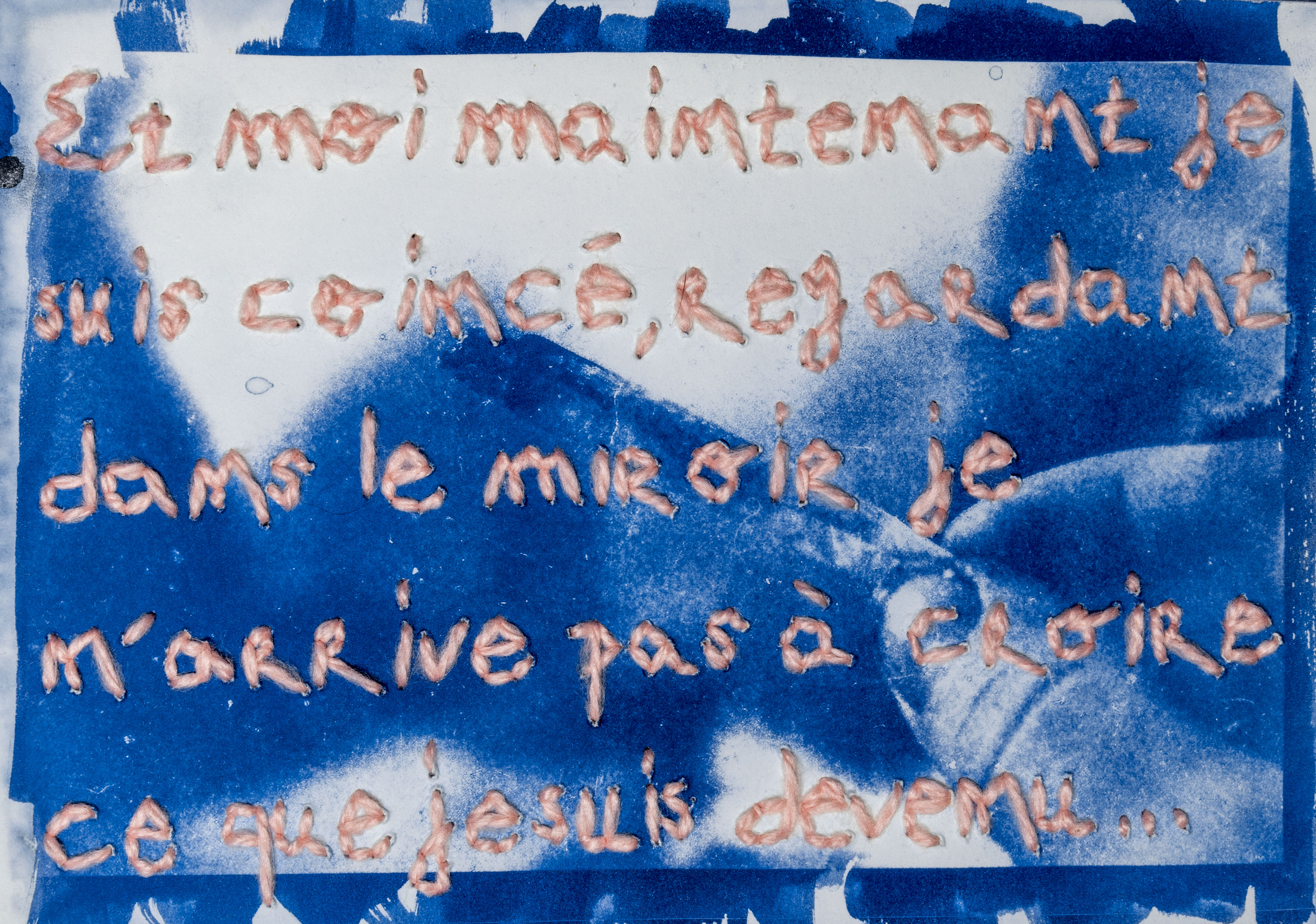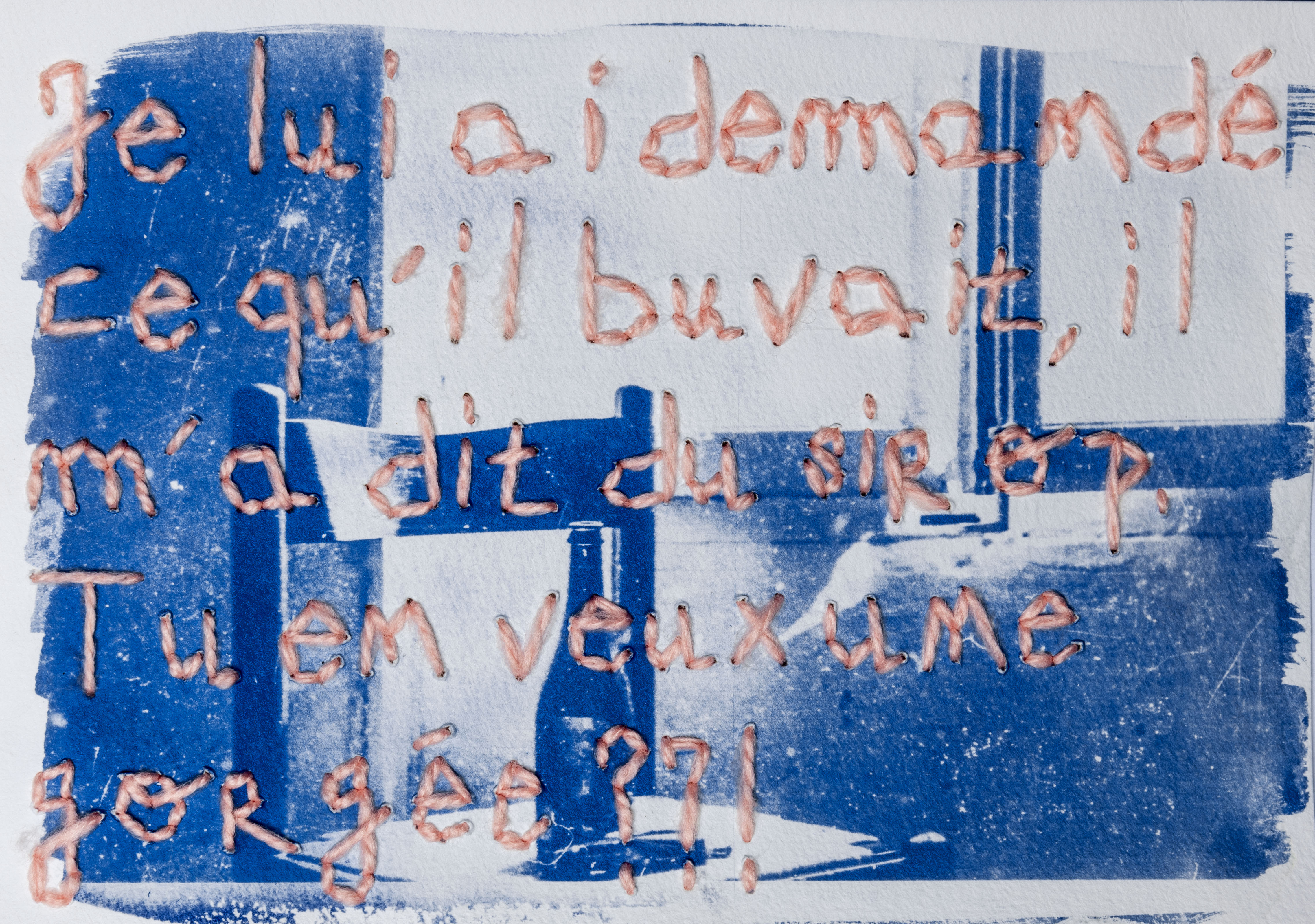 J’ai commencé à photographier Didier parce qu’il me fait beaucoup penser à mon père Olivier. Ils partagent un talent pour l’humour ainsi qu’un goût prononcé pour l’alcool en très grosse quantité. Olivier lui n’a pas trouvé la force de résister face au poids de ses problèmes et il a décidé de se suicider. J’ai gardé de lui des pellicules argentiques et une lettre d’adieux, que je choisi de lier ensemble en réalisant des cyanotypes sur lesquels je viens broder ses derniers mots. J’envisage la broderie comme un acte de soin pour transformer le trauma en objet de mémoire.