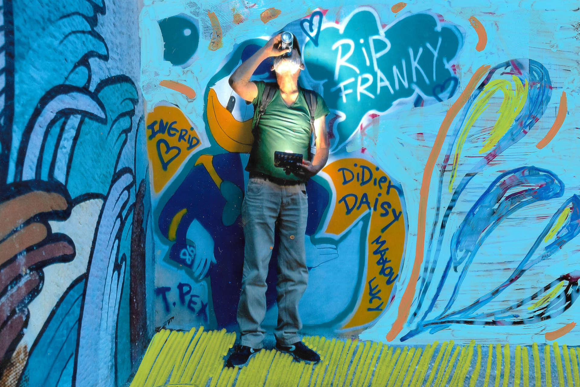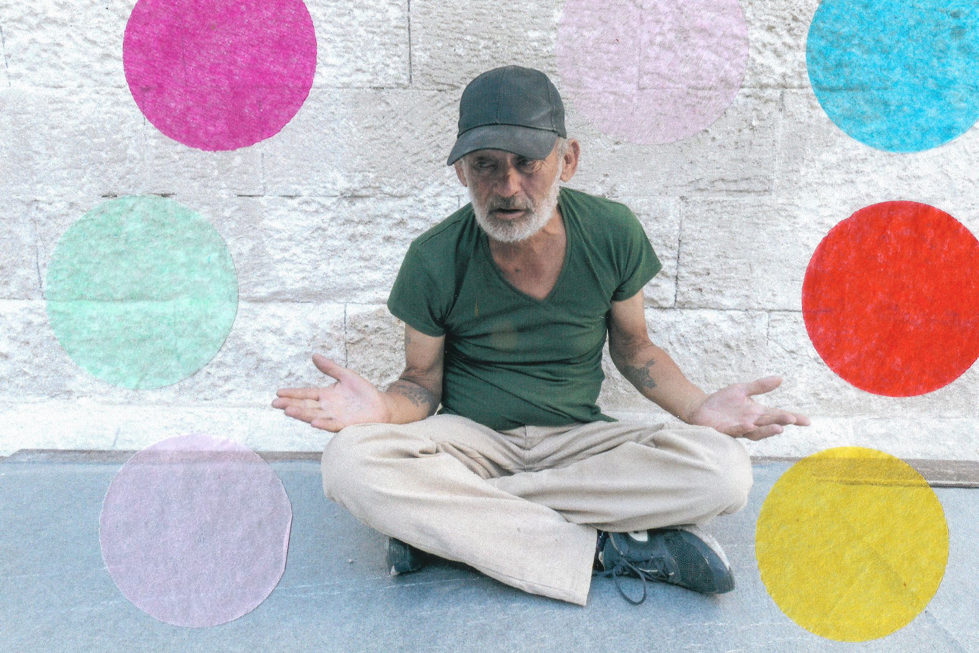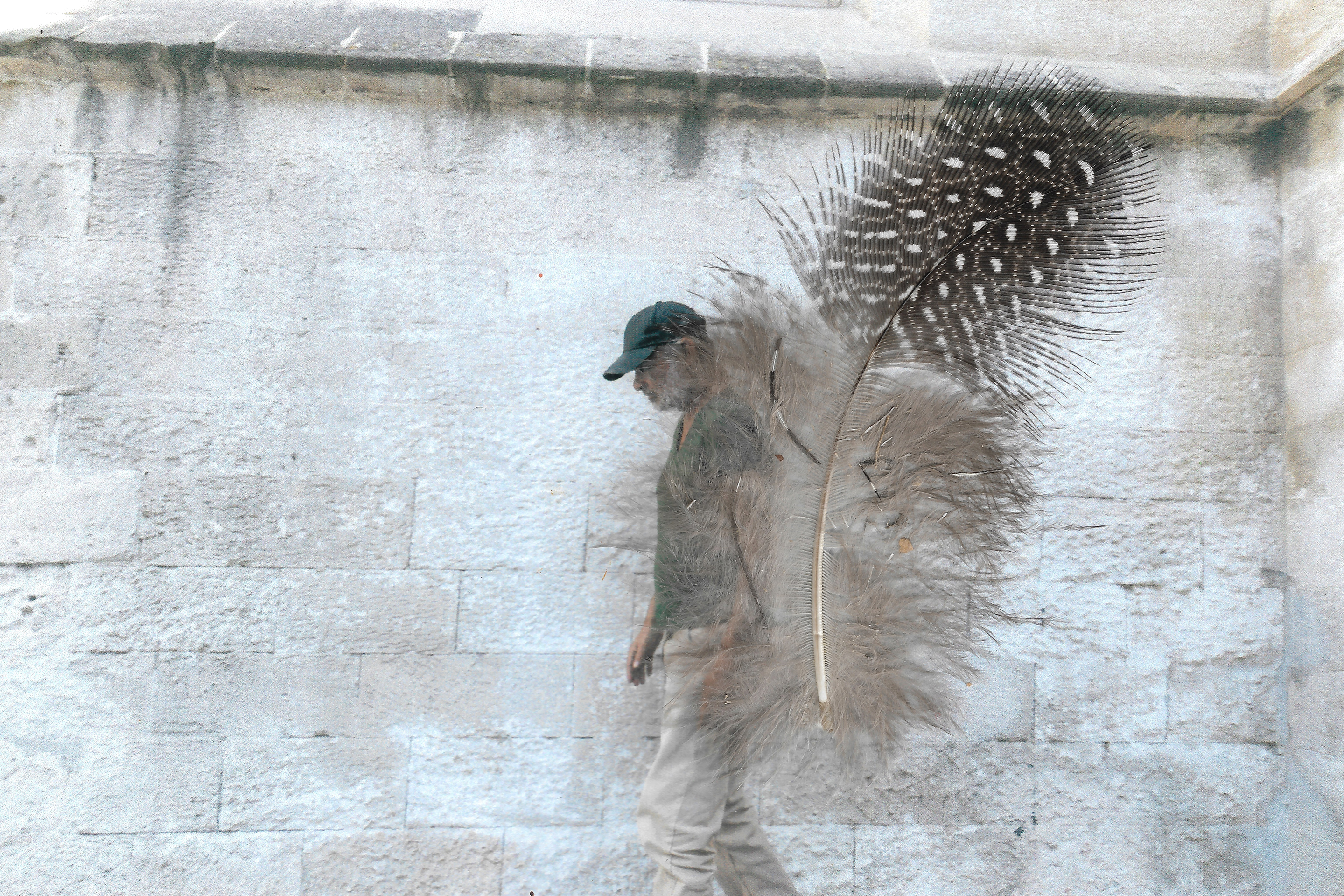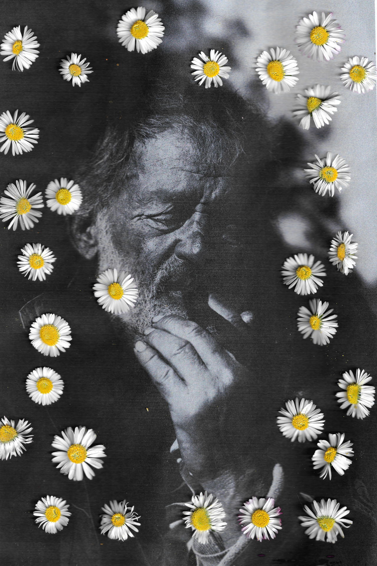 Ce projet est né d’un dialogue entre l’intime et le social. Il met en résonance les sensibilités de deux personnages partageant la même vulnérabilité. Deux hommes liés par l’isolement et l’alcool, stigmatisés par la précarité. Il y a d’un côté Didier, accompagné par sa chienne Daisy, habitués des trottoirs et des bancs publics. Il porte en lui les traces d’une existence marquée par le rejet, les excès et une forme de résistance joyeuse utilisée comme bouclier. Il prône un bonheur simple, des bières, une blague, du reggae. On se donne rendez-vous dans les rares lieux de la ville dans lesquels il ne se sent pas jugé : la cour arrière du cloître, les escaliers derrière l’église, la marche devant la boulangerie pour faire charger son téléphone. Didier met de la musique et la session photo commence. On discute beaucoup puis je lui apporte les images imprimées, parce qu’il m’a avoué qu’avant de démarrer ce projet il avait oublié à quoi il ressemblait. J’interviens ensuite sur les tirages en ajoutant ou grattant de la matière pour retranscrire mon ressenti sur ces instants partagés. C’est une manière de redonner de l’épaisseur à un homme que la société a aplati par le stigmate.